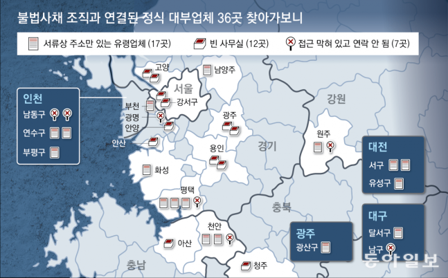불법사채 조직과 연결된 정식 대부업체 36곳의 주소지를 4월 24일~5월 14일 모두 방문했다. 그 결과 서류상 주소만 있는 ‘유령업체’가 17곳이었다. 다른 12곳은 사무실은 있었지만 비어있었고, 일부는 전용면적이 3.3㎡도 되지 않았다. 나머지 7곳은 접근이 막혀 있어 사무실 상태를 눈으로 확인할 수 없었다.