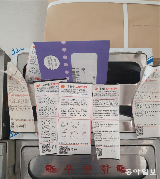 지난달 9일 불법사채와 연결된 대구 남구의 한 대부업체의 우편함에 부재중 쪽지가 더덕더덕 붙어있다. 이 사무실엔 대부업체가 56개나 입점해있었다.