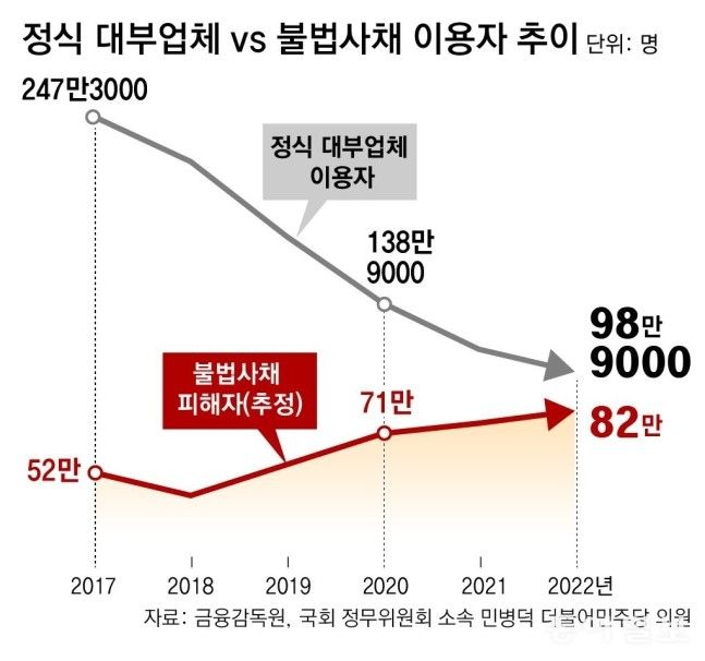 한국대부금융협회 관계자는 “정식 대부업체들이 싸잡아 매도당해 이미지에 타격을 입고 있다”고 말했다. 금융감독원에 따르면 정식 대부업체 이용자는 2017년 247만 명에서 2022년 98만 명으로 줄었는데, 불법사채 이용자는 같은 기간 52만 명에서 82만 명으로 늘어난 것으로 추정됐다.