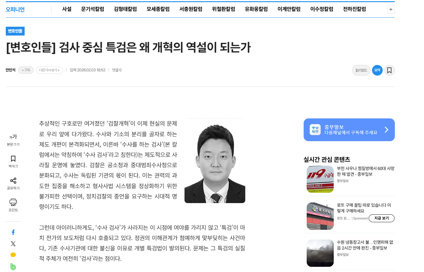 KANGMUL NEWS[중부일보 칼럼] 검사 중심 특검은 왜 개혁의 역설이 되는가 - 안민석 변호사