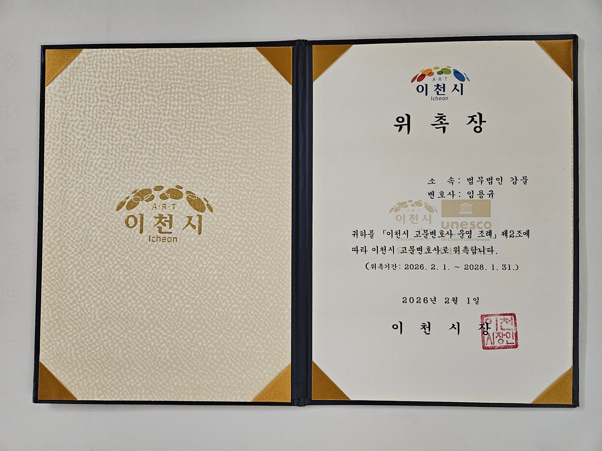 2026년 2월 4일, 법률사무소 강물 임용규 변호사가 이천시 고문변호사로 위촉되었습니다.
