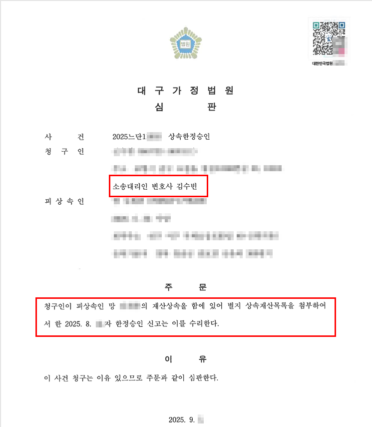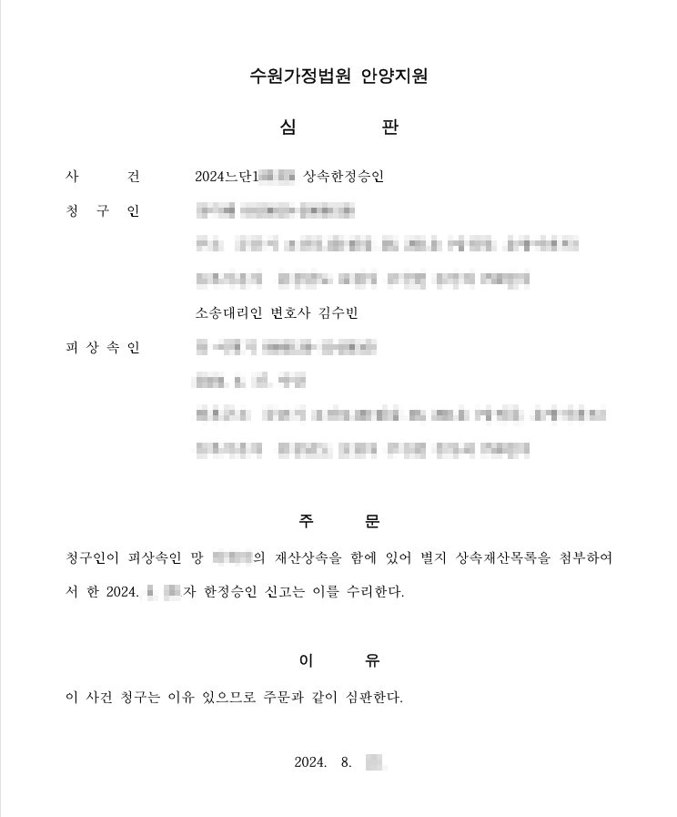 [상속한정승인/인용결정] 연락이 끊겼던 아버지의 채무로부터 벗어나기 위하여 상속한정승인 받은 사안