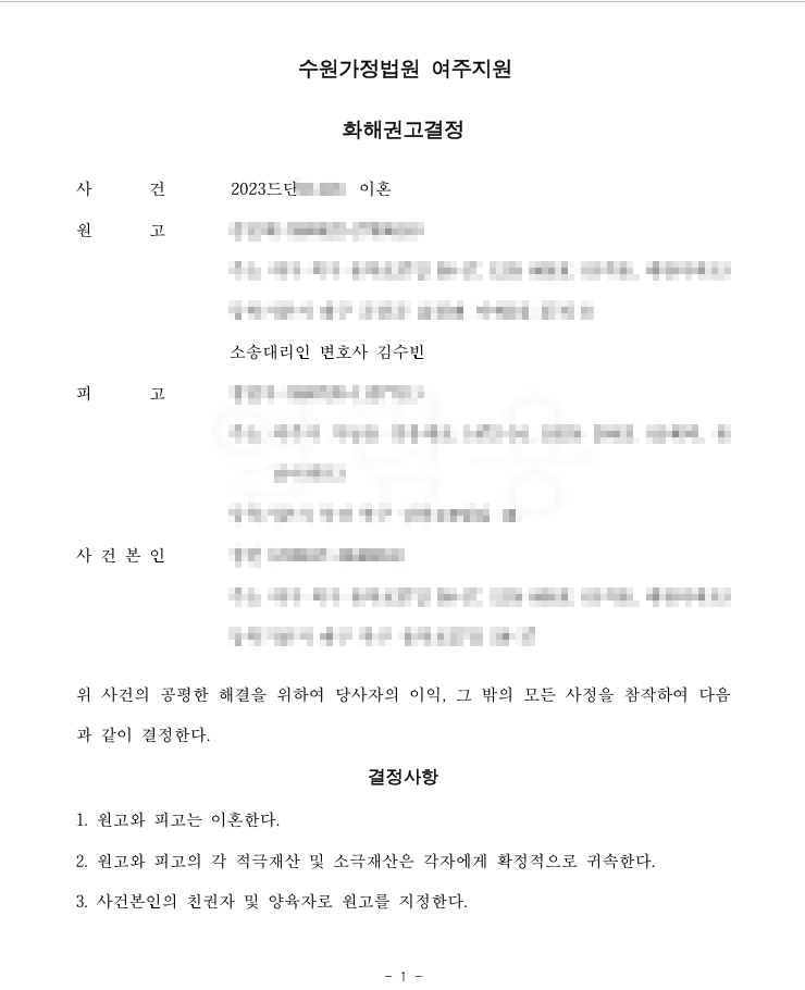 [이혼/조정성립] 변호사의 조력으로 원만하게 화해권고를 통하여 친권 및 양육권을 확보하고, 이혼에 이른 사안