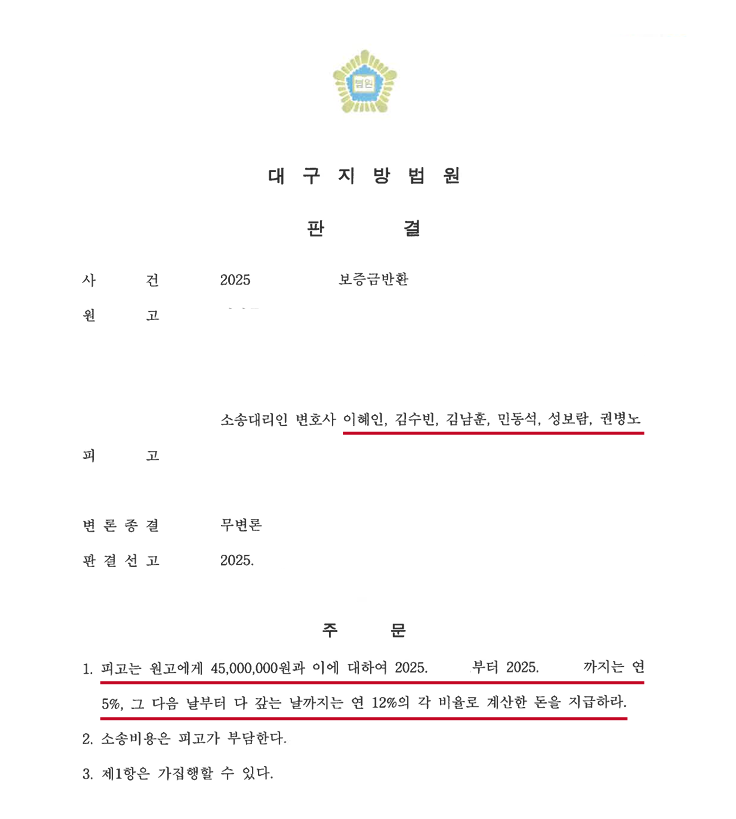 [보증금/전부승소] 임대차 종료 후 미반환 보증금 청구 전부 인용 사례