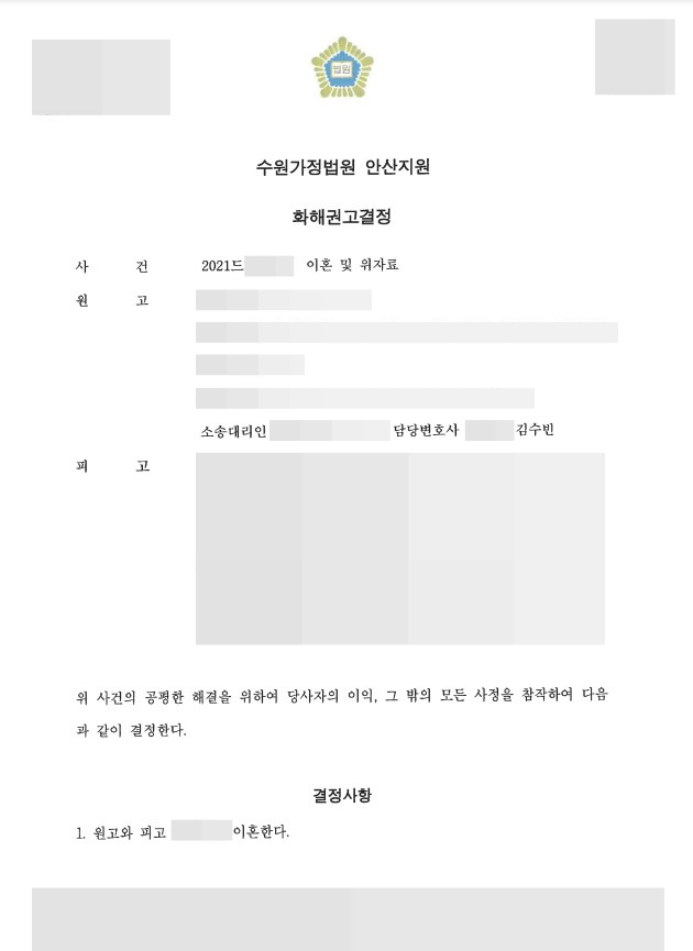 법원은 제출된 합의서를 토대로 원고와 피고의 이혼을 승인하고, 재산분할 및 위자료로 피고 1 명의의 모든 부동산을 채무 인수와 함께 원고의 명의로 하기로 하는 화해권고 결정을 하였습니다. 법률사무소 강물은 복잡한 법적 문제에서도, 그 상황에 따라 의뢰인의 권리를 지키고, 최선의 결과를 이끌어내는 데 최선을 다하고 있습니다.