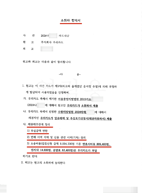 그 결과, 우리카드가 진행한 압류추심명령신청은 해제되었으며, 우리카드가 추심해 간 금액 전액을 반환하는 것과 함께 변호사비용 등 소송비용도 회수하는 조건으로 소취하에 동의하였습니다.