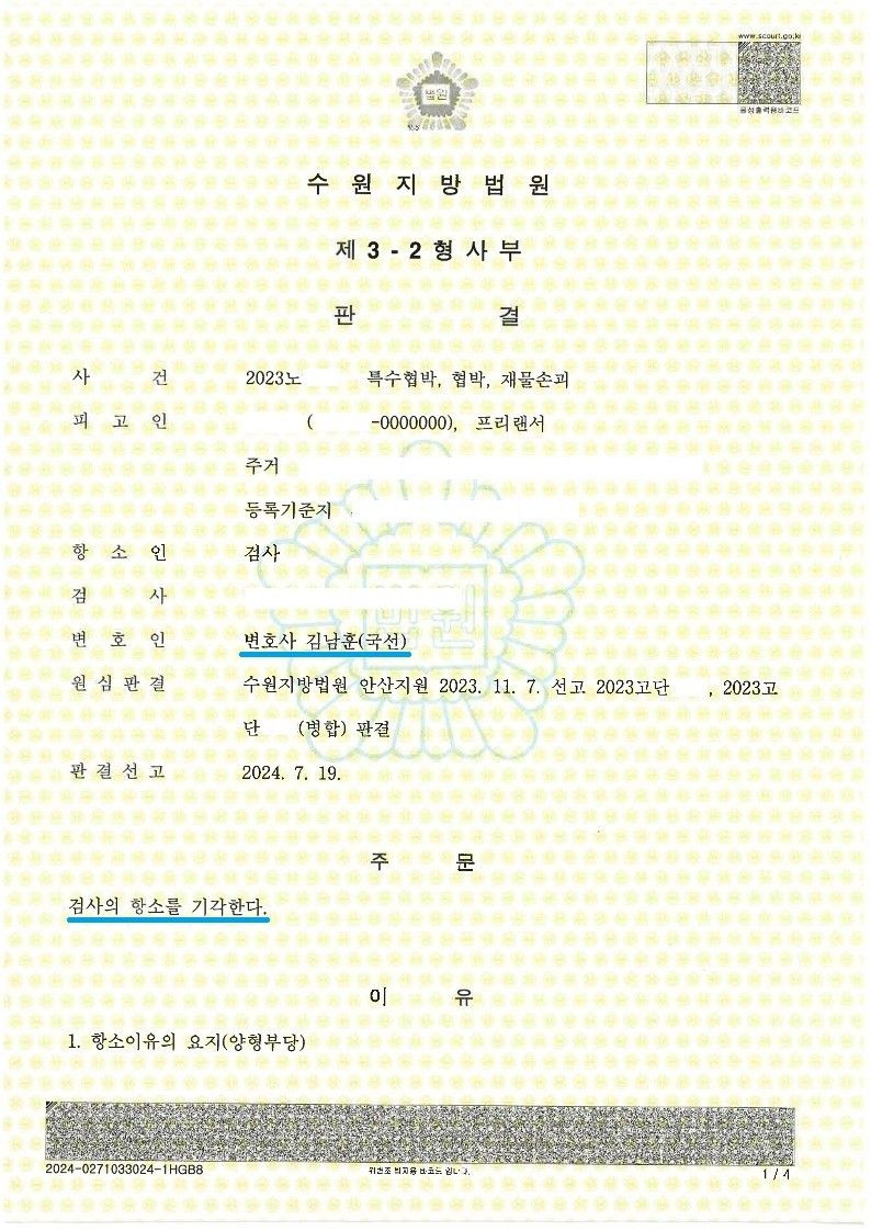 SUCCESS STORY[특수협박, 재물손괴/검사항소기각] 헤어진 연인을 과도로 협박하고, 주거지 등의 물건을 파손한 사건에서 검사의 항소를 성공적으로 기각한 사례