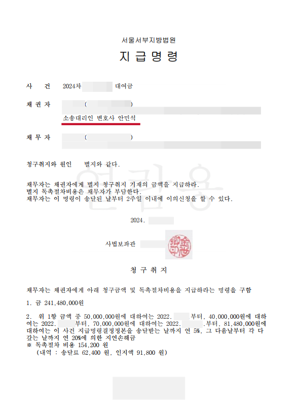 강물 변호사는 서울서부지방법원에서 채권 압류 및 추심명령을 받아 채무자의 재산에 접근할 수 있는 권리를 확보했습니다. 이후 법원으로부터 지급명령을 확정받아 채무자로부터 금전을 회수할 수 있는 법적 근거를 마련했습니다. 법률사무소 강물 채권추심 변호사의 세심한 법적 조치와 철저한 절차 진행으로 의뢰인은 법적 권리를 보호받을 수 있었습니다.