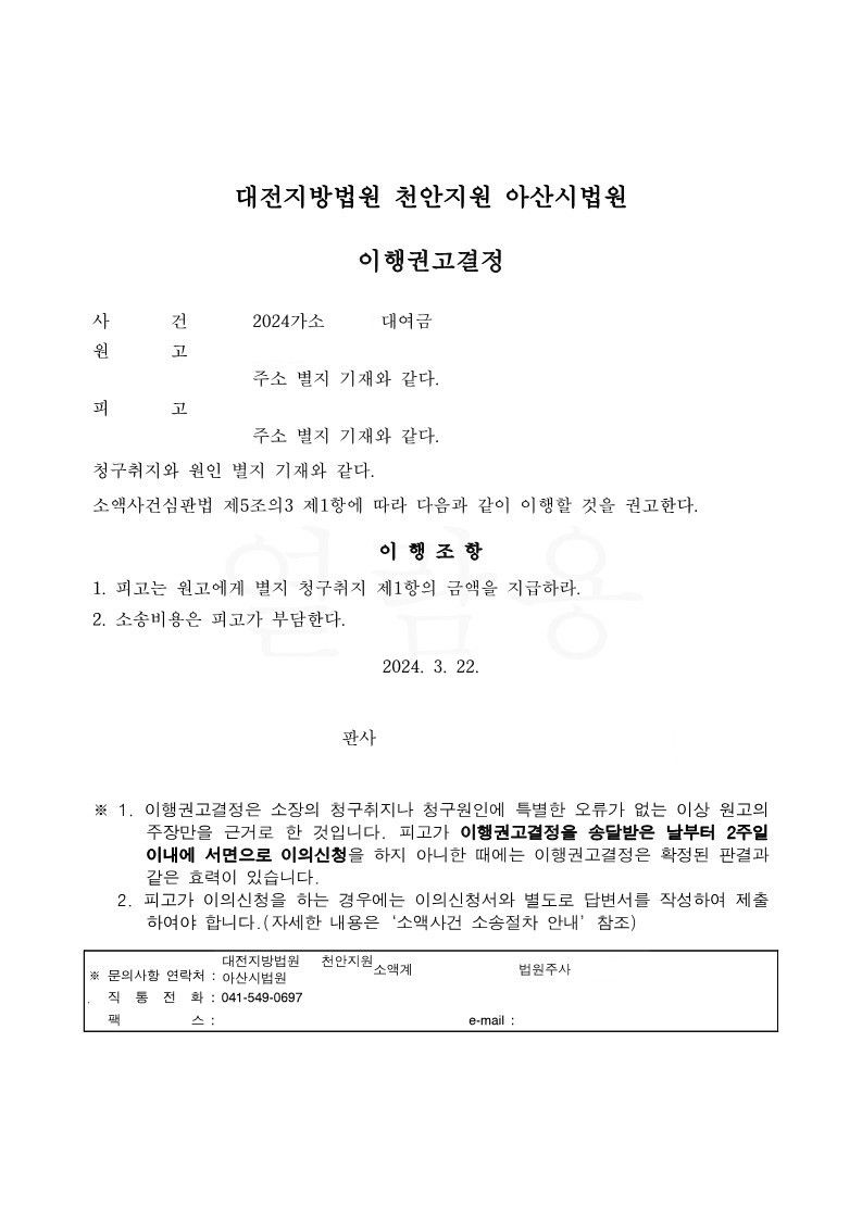 이 사건 재판부에서는 의뢰인의 청구가 타당하다고 판단하여 아래와 같이 이행권고결정을 내렸습니다.