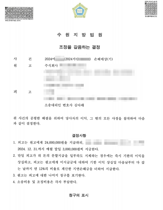 양측의 서면공방이 오갔고, 이 사건은 조정으로 회부되었습니다. 본 소송대리인은 의뢰인의 이익을 위하여 임의로 산정한 금원 등을 토대로 협상에 나아갔고, 오랜 시간 조정이 계속되었습니다.
