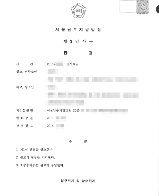 SUCCESS STORY[공사대금/전부승소] 공사 관련 공동사업약정과 지불각서의 해석을 통해 1심의 판결을 파기, 원고의 청구를 전부 기각시킨 사안