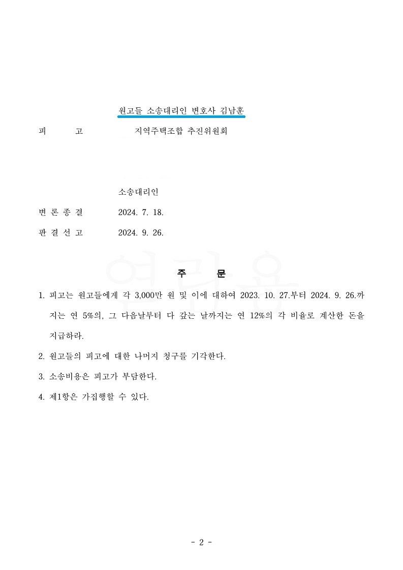 이 사건 재판부는 위와 같은 원고 조합원들 측 주장을 받아들이고, 피고 지역주택조합 측 주장은 모두 이유 없다고 판단하여 아래와 같이 원고들 승소 취지의 판결을 선고하였습니다.