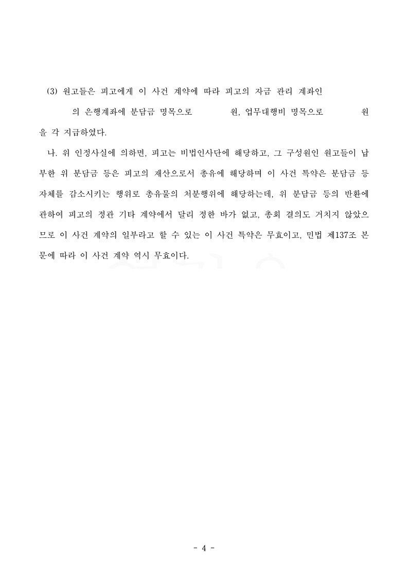 피고는 비법인사단에 해당하고, 그 구성원인 원고들이 납 부한 위 분담금 등은 피고의 재산으로서 총유에 해당하며 이 사건 특약은 분담금 등 자체를 감소시키는 행위로 총유물의 처분행위에 해당하는데, 위 분담금 등의 반환에 관하여 피고의 정관 기타 계약에서 달리 정한 바가 없고, 총회 결의도 거치지 않았으 므로 이 사건 계약의 일부라고 할 수 있는 이 사건 특약은 무효이고, 민법 제137조 본 문에 따라 이 사건 계약 역시 무효이다.