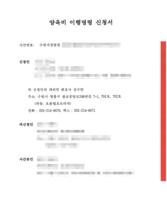 변호사는 우선 당사자가 협의이혼 당시 미성년 자녀의 양육비 부담에 대하여 작성한 양육비부담조서의 원본을 확보하고 월 10만원 가량의 양육비가 설정되어 있는 것을 확인하였습니다. 또한 계좌이체 내역 등을 통해 양육비가 지급되지 않아왔음을 확인하고 양육비 이행명령이라는 간이한 절차를 통해 집행권원을 확보하고자 하였습니다.