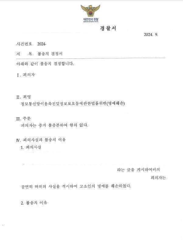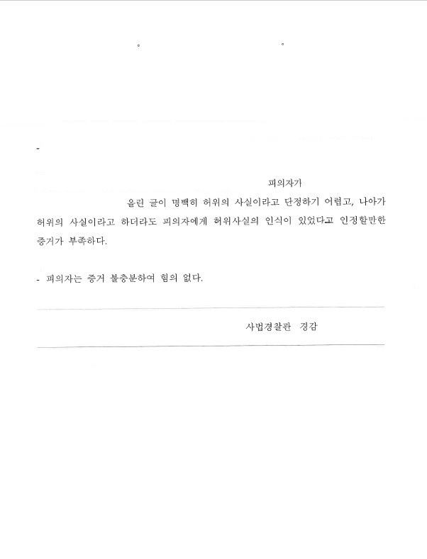 증거불충분 혐의없음 결정을 받을 수 있었고,그 불송치결정 이유에 대해 보면 명백히 허위의 사실이 아니라고 단정하기 어렵고, 나아가 허위의 사실이라고 하더라도 허위사실의 인식이 있었다고 인정할만한 증거가 부족하다는 취지로 불송치 받게 되었습니다.