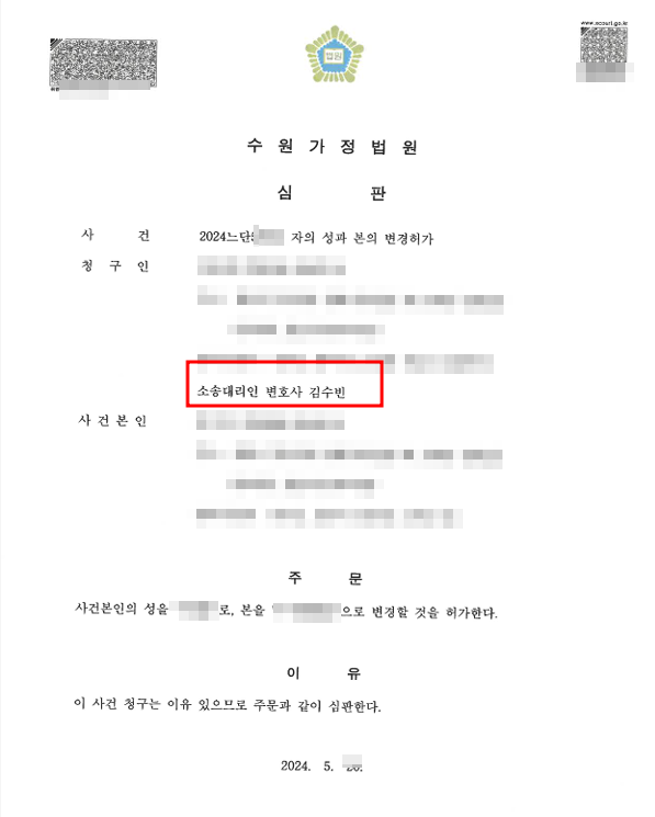 SUCCESS STORY[성본변경/인용결정] 재혼 후 자녀의 성본변경을 신청하여 허가 받은 사안