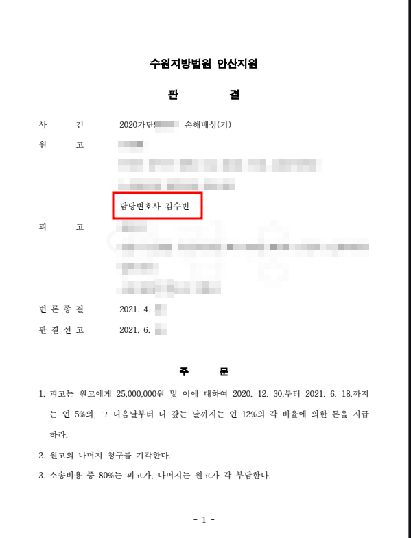 재판부는 변호사의 의견을 상당 부분 받아들였고, 이혼에 이르지 않았음에도 청구금액(3,000만원)의 80% 이상인 2,500만원을 인정하였습니다.