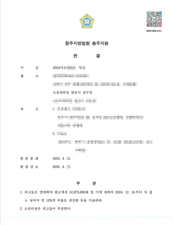 의뢰인은 변호사의 도움을 받아, 자신의 팀장(오야지) 및 원청 회사를 상대로 1,000만원이 넘는 임금과 이에 대한 지연손해금을 청구하였습니다.