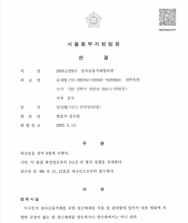 이로 인해 전자금융거래법 제49조 제4항 제1호, 제6조 제3항 제1호 위반 혐의로 서울동부지방법원에 기소되었습니다.
