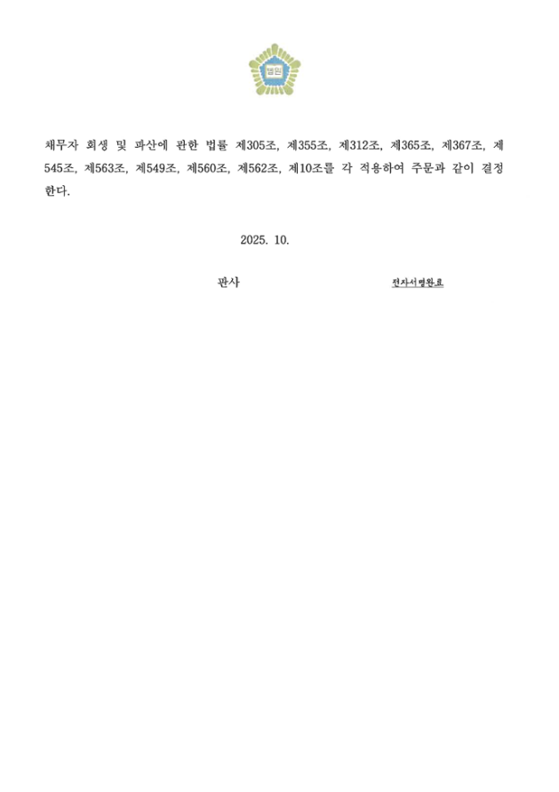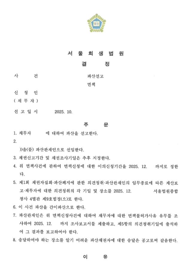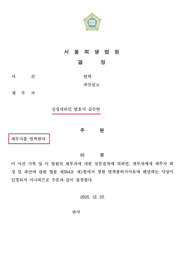 이후, 서울회생법원의 신속한 결정으로 2025. 10. 13. 파산선고결정, 2025. 12. 22. 면책결정으로