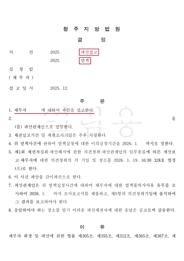 2025. 12. 15. 파산선고결정을 득하여 채무의 독촉에서 벗어나게 되었습니다.