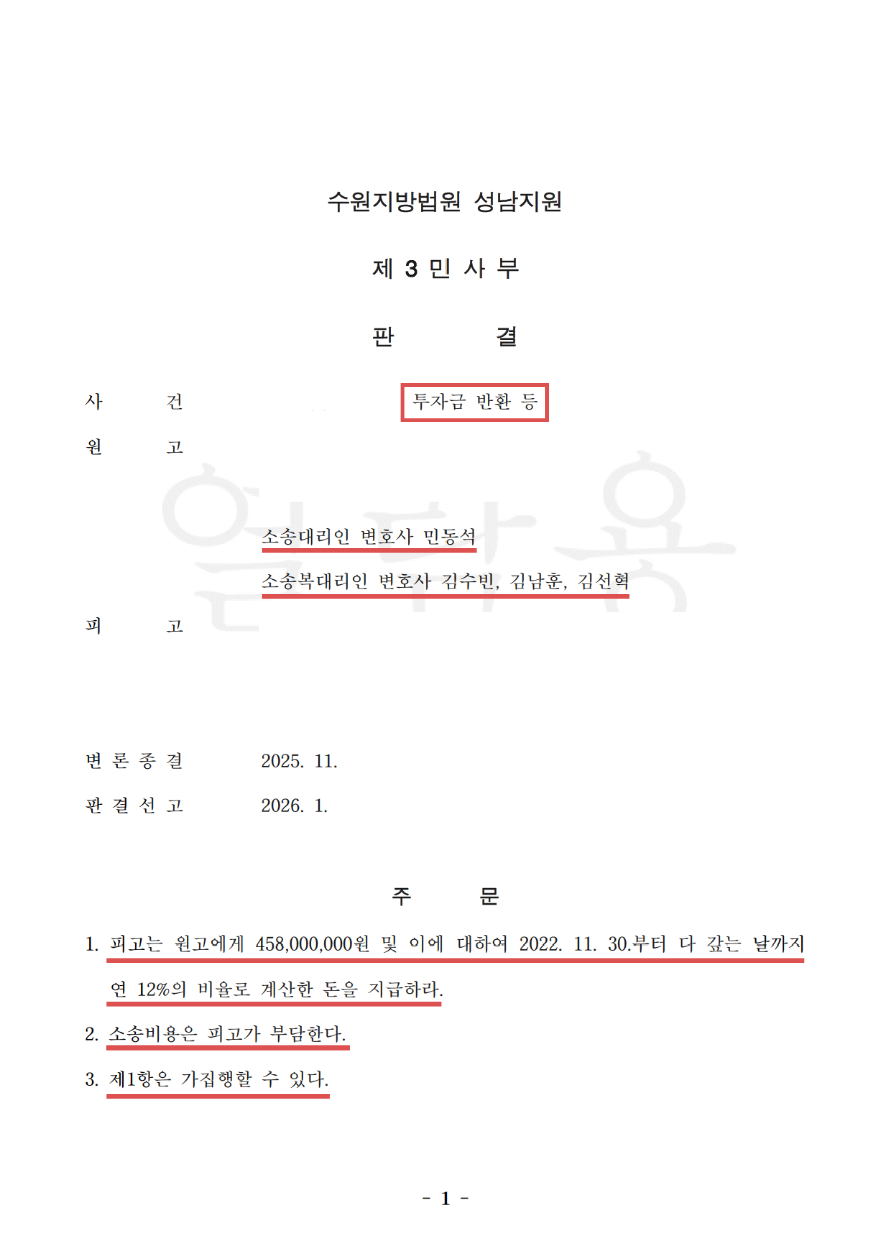 SUCCESS STORY[전부승소] 투자금 반환, 이행각서에 따른 약정금 지급 청구가 인정된 사례