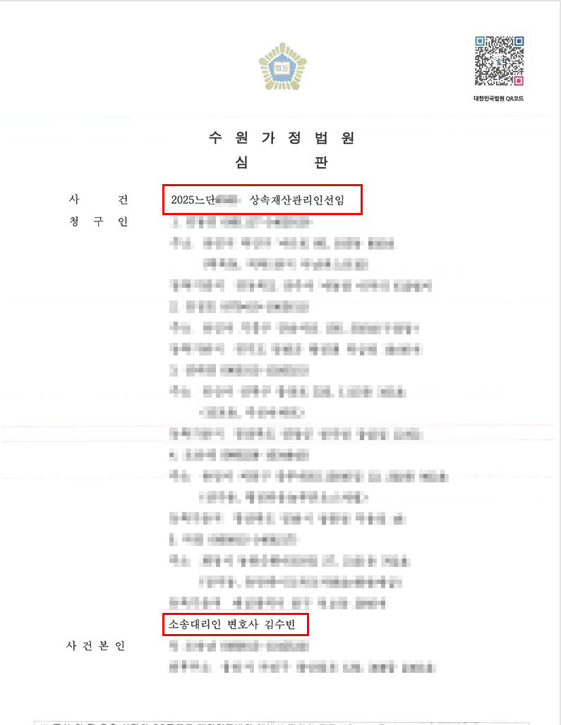 수원가정법원은 청구인들의 신청을 인용하여 변호사를 상속재산관리인으로 선임하는 심판을 하였습니다.