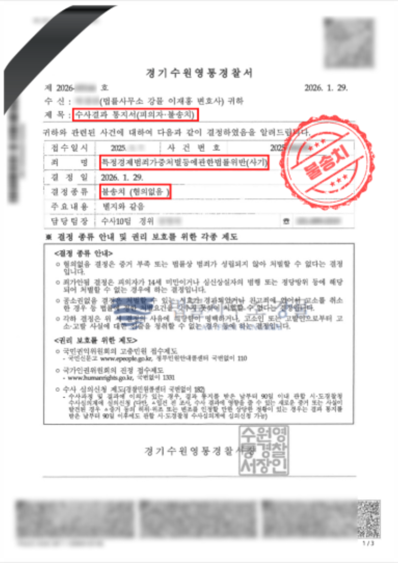 수사기관은 양측의 금전관계가 장기간에 걸쳐 형성된 복합적 거래 구조임을 인정하여, 일부 송금 내역만을 근거로 사기죄의 기망 및 편취 고의를 단정하기 어렵다고 판단하였습니다. 이에 의뢰인에 대하여 특경법 사기 불송치(혐의없음) 결정을 내렸습니다.