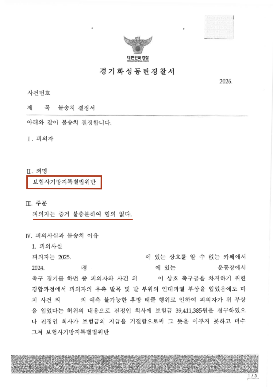 SUCCESS STORY[보험사기방지특별법위반/불송치] 축구 경기 부상 관련 보험사기 의혹, 증거 불충분으로 혐의없음 이끌어낸 사례