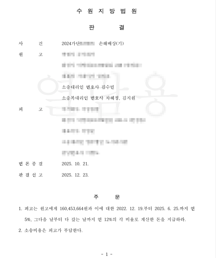 이에 법원은 상대방이 의뢰인에게 160,453,664원 및 이에 대하여 화재 발생일부터 지연손해금을 지급하라고 판결하였으며, 소송비용 전부를 상대방이 부담하도록 하였습니다