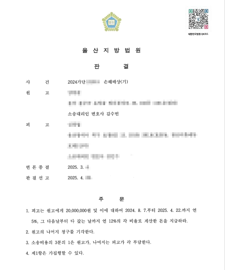 법원은 저희의 주장을 전면 받아들여 상대방(피고)이 의뢰인에게 금 20,000,000원 및 이에 대한 지연손해금을 지급하라는 판결을 선고하였습니다