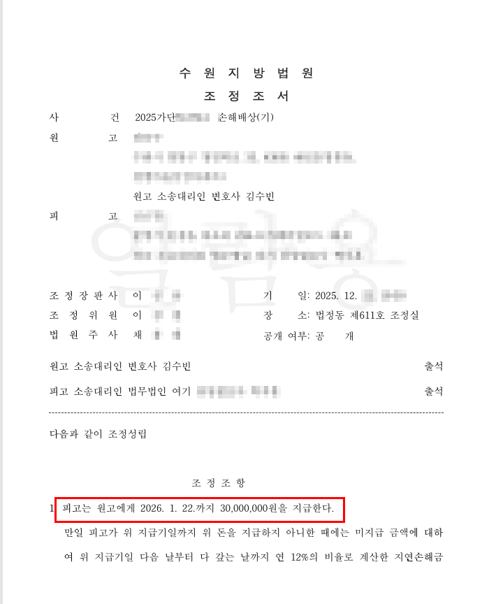 3,000만원 조정[이혼 · 상속][상간소송/조정성립] 남편과 상간을 한 상간녀에 대하여 손해배상 청구 하였고, 3,000만원으로 조정한 사안
