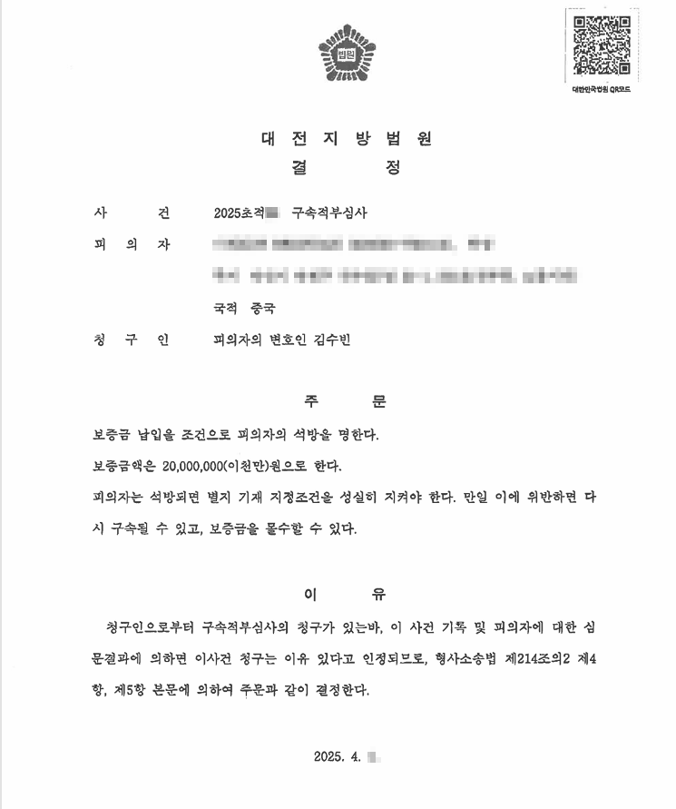 석방결정[형사, 외국인][구속적부심사/석방결정]보이스피싱 피해금액을 환전하였다는 혐의를 받고 있는 중국 국적인에 대하여 구속적부심사 인용