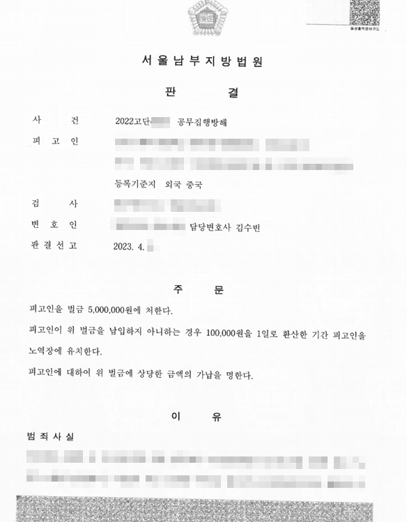 벌금형[형사, 외국인][공무집행방해/벌금형] 중국 국적의 자가 술에 취해 출동경찰관들을 폭행하여 징역 2년이 구형되었으나, 벌금형으로 방어한 사안