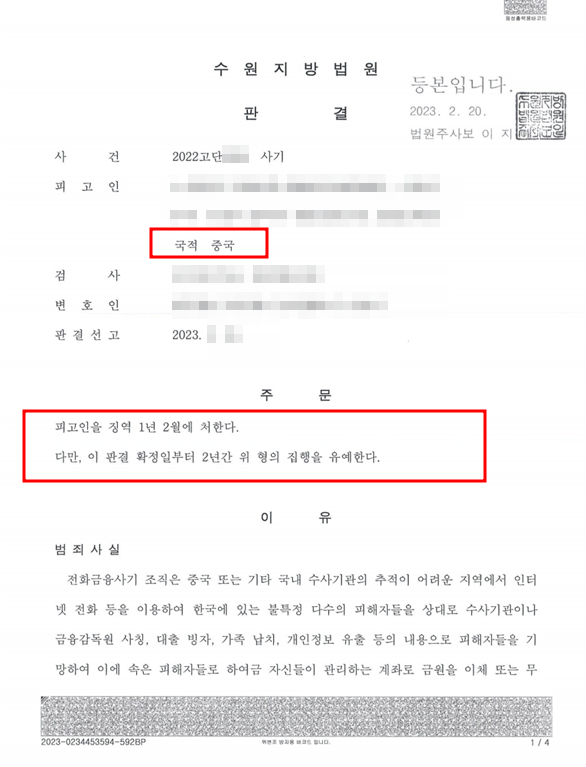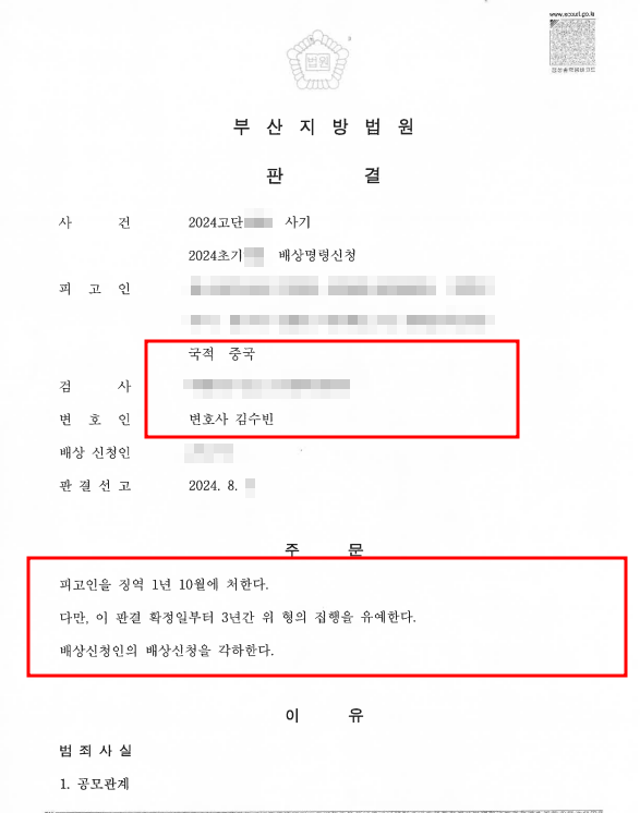 집행유예[외국인, 형사][보이스피싱/집행유예] 보이스피싱 수거책에 가담한 중국 국적의 의뢰인을 변호하여 집행유예의 선처를 받은 사안