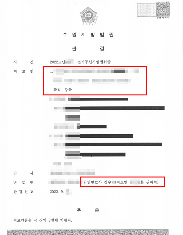 집행유예[형사, 외국인][전기통신사업법위반/집행유예]다른 외국인들의 명의로 선불유심 개통 신청을 하여 대포폰을 유통한 피고인에 대하여 집행유예의 선처를 얻은 사안