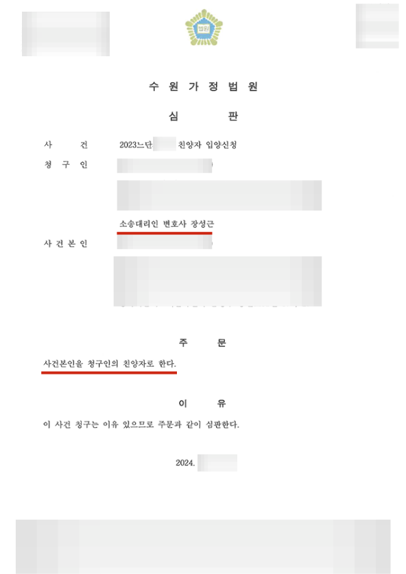 [친양자입양] 법률사무소 강물의 법적 조력으로 인한 친양자입양 인용결정