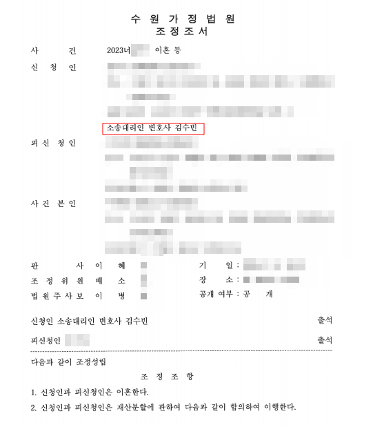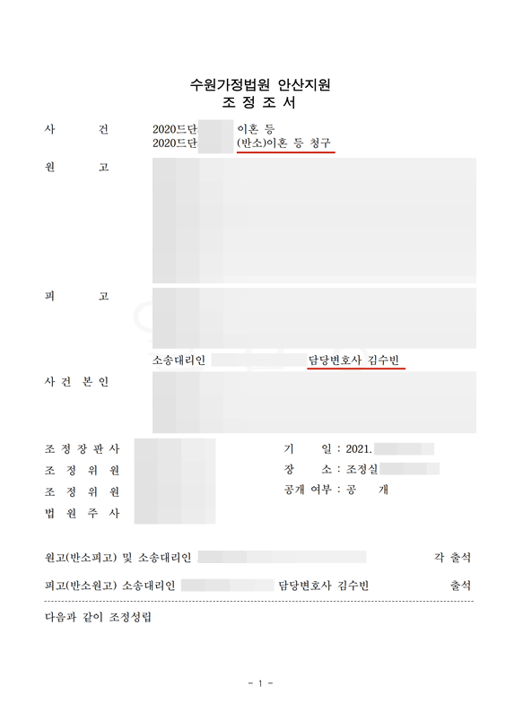 [이혼 등/재산분할 1억원] 이혼을 원하는 아내를 대리하여, 조정을 통해 1억원의 재산분할을 한 사안