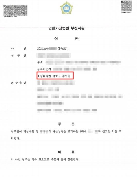 [상속포기/인용결정]연락 두절된 아버지의 사망사실을 뒤늦게 알고 상속포기에 나아간 사안