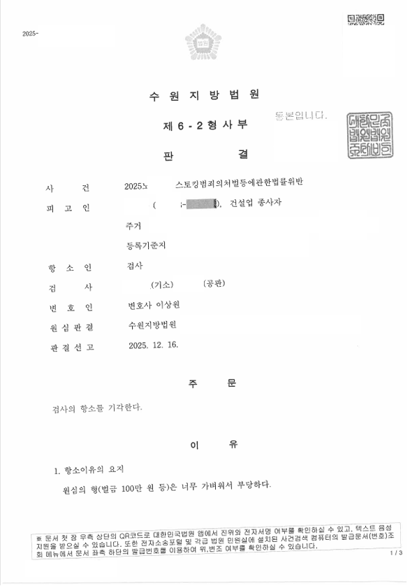 [스토킹/검사항소기각] 스토킹 사건임에도 불구하고 1심에서 벌금형을 선고받았고, 검사가 이에 항소하였으나 검사의 항소를 기각시킨 사안