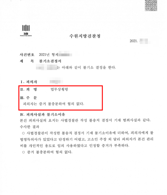 [업무상횡령/혐의없음]오피스텔을 관리하는 사실상 관리자가 관리비를 횡령하였다는 혐의로 고발당하였으나 혐의없음을 받아낸 사안