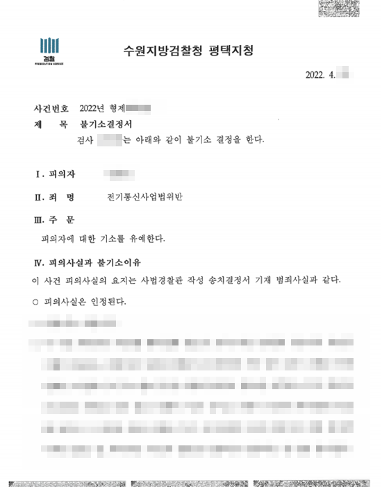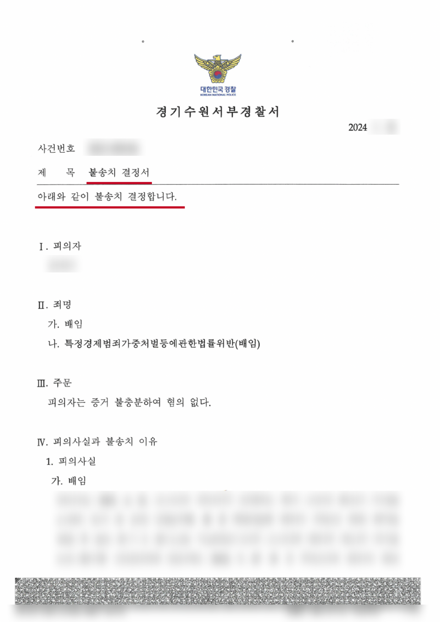 불기소(혐의없음)[형사][사기]투자 사업 확장 실패 후 사기 혐의로 고소당한 의뢰인, 불기소처분으로 사건 종결