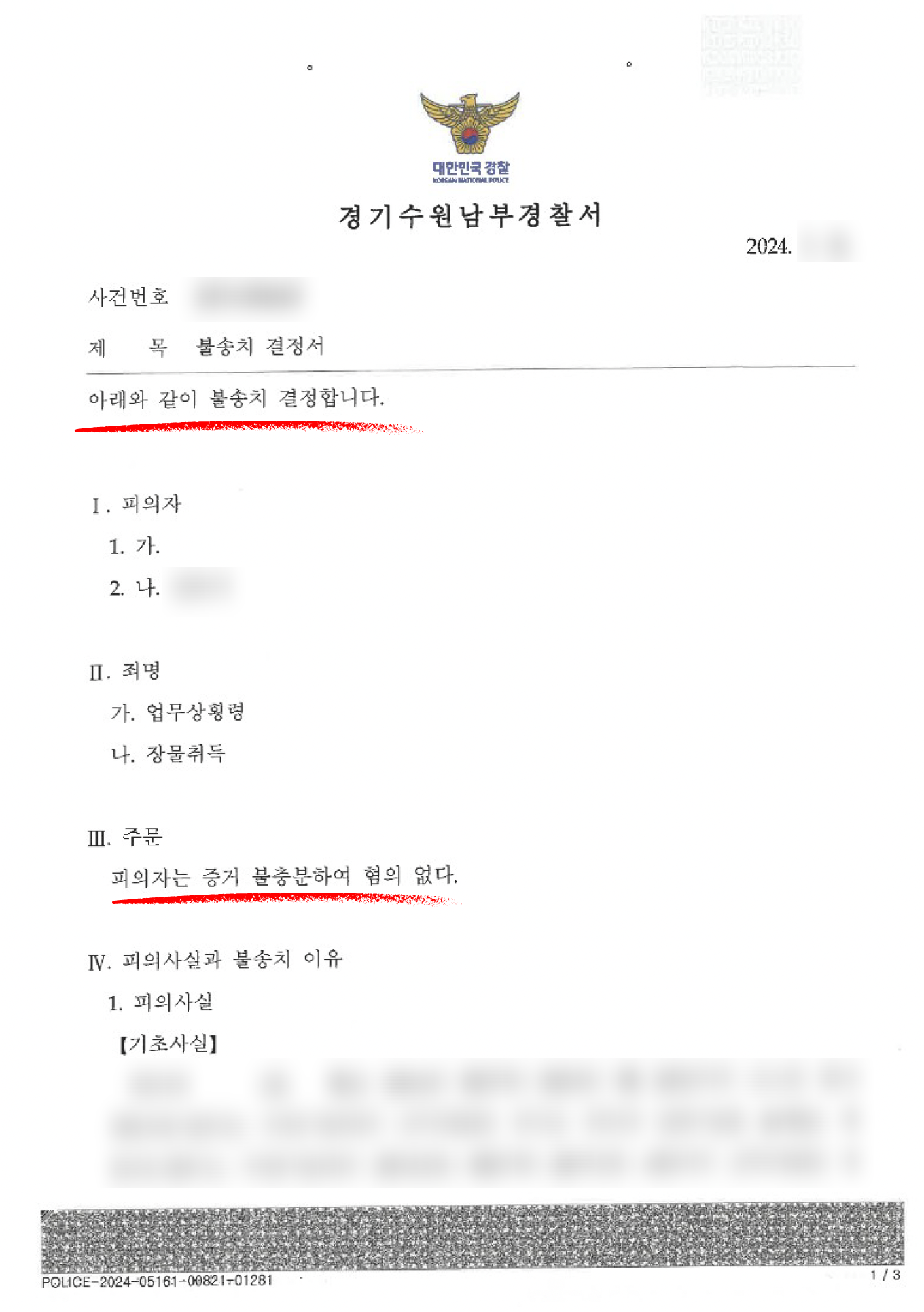 불송치(혐의없음)[형사][횡령] 업무상 횡령 혐의를 받은 의뢰인, 변호사의 철저한 증거 제시로 불송치 결정 이끌어내